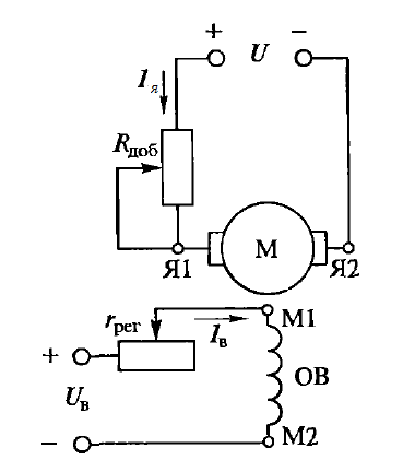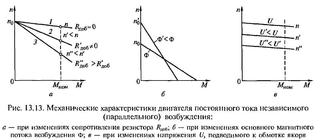 Если же хотя бы один из перечисленных параметров двигателя изменен (напряжение на обмотках якоря или возбуждения отличаются от номинальных значений, или же изменено сопротивление в цепи якоря введением Rдоб), то механические характеристики называют искусственными.
