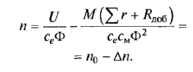 При оценке регулировочных свойств двигателей постоянного тока наибольшее значение имеют механические характеристики n = f(M). При неизменном моменте нагрузки на валу двигателя с увеличением сопротивления резистора Rдоб частота вращения уменьшается. Сопротивления резистора Rдоб для получения искусственной механической характеристики, соответствующей требуемой частоте вращения n при заданной нагрузке (обычно номинальной) для двигателей независимого возбуждения: