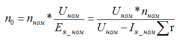 где U — напряжение питания цепи якоря двигателя, В; Iя — ток якоря, соответствующий заданной нагрузке двигателя, А; n — требуемая частота вращения, об/мин; n0 — частота вращения холостого хода, об/мин.
