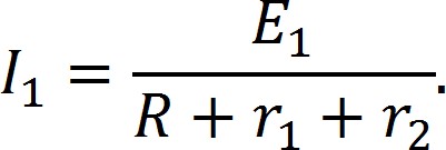 На рисунке 1 приведена схема с двумя источниками ЭДС: E1 и E2. Источники имеют внутренние сопротивления r1 и r2. Нагрузка условно обозначена резистором с сопротивлением R. Так как в цепи отсутствуют разветвления, то ток во всех ветвях будет одинаков и равен I