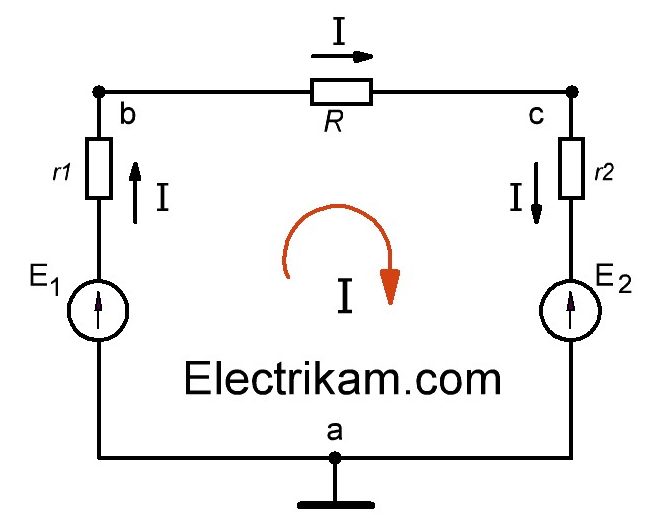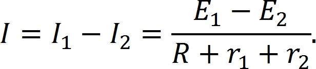 Если значения E1 и E2 различны, то в цепи возникает ток, направление которого совпадает с током, создаваемой «большим» ЭДС. Иными словами, если E1 > E2, то направление тока совпадает с ЭДС E1, если E1 < E2, то направление тока будет противоположным. На рисунке 1 выбранное направление тока соответствует первой ситуации (E1 > E2).