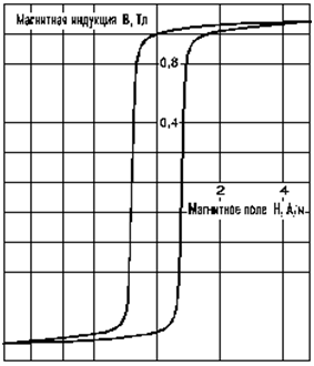 В пермаллоях, где петля гистерезиса имеет форму, напоминающую прямоугольник (рис. 1), уровень её близости к классической прямоугольной форме соответствует отношению значений остаточной (Br) к наибольшей (Bmax) индукции. За Bmax здесь принимается показатель индукции в поле, с напряженностью выше коэрцитивной силы в 5-10 раз. Данное отношение может составлять до 0,85-0,99. Коэрцитивная сила у подобных пермаллоев составляет от 1 до 30 А/м.