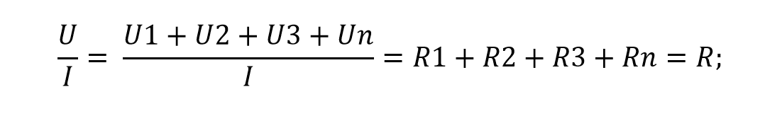 Ряд последовательно соединенных резисторов можно заменить эквивалентным (общим) сопротивлением R, причем так, чтобы эта замена при неизменном напряжении на выводах соединения не вызвала изменения тока в цепи. Разделив на ток правую и левую части уравнения (2), получим