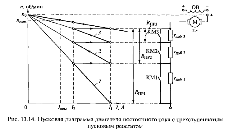 В основе графического метода лежит пусковая диаграмма двигателя. Пусковая диаграмма, представленная на рис. 13.14, совмещена с трехступенчатым пусковым реостатом; K1, К2 и КЗ являются контактами силовых контакторов, посредством которых осуществляется переключение ступеней реостата, а rдоб1, rдоб2 и rдоб3 — резисторы ступеней пускового реостата. Механические характеристики 1, 2, 3 соответствуют ступеням пускового реостата RПР1, RПР2 и RПР3. Значения начального пускового тока I1 и тока переключений реостатов I2 обычно принимают